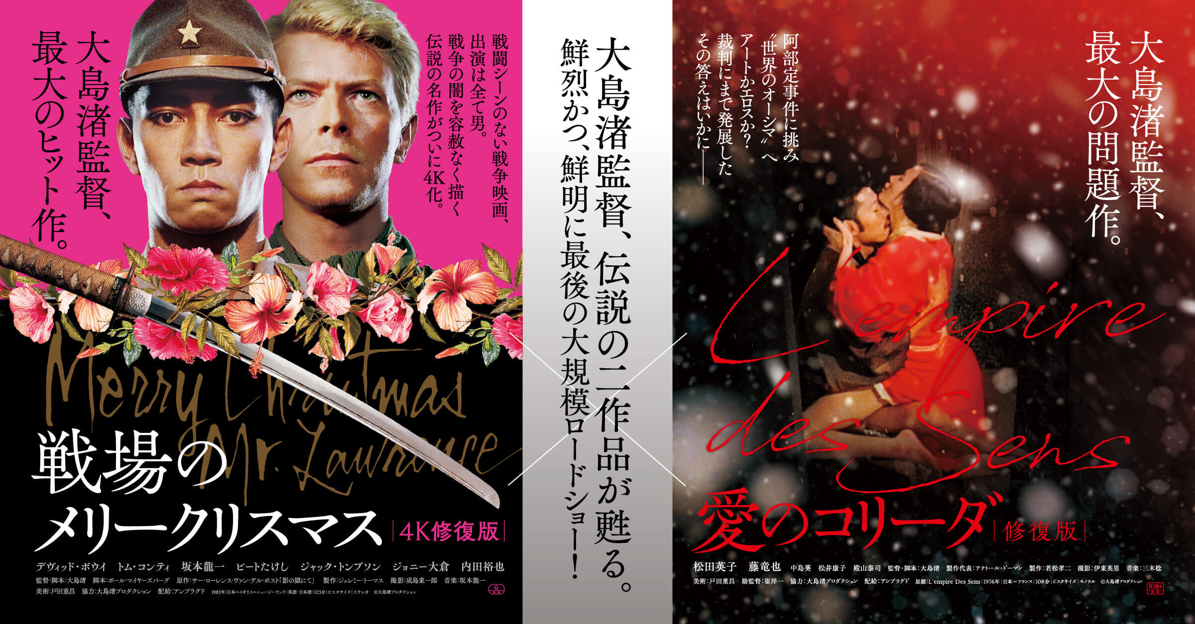 第36回カンヌ国際映画祭で、そのテーマを巡って大きな話題を巻き起こした本作は、デヴィッド・ボウイ、坂本龍一、ビートたけし、内田裕也などの本業が俳優ではない個性的なキャスティングで原作者の日本軍俘虜収容所での体験を描いた、戦闘シーンが一切登場しない異色の“戦争”映画。俘虜となるジャック・セリアズ少佐を演じたデヴィッド・ボウイの美しさと存在感が随所で際立ち、坂本龍一扮するヨノイ大尉が次第にセリアズに惹かれていく様が描かれる。東洋と西洋の文化の対立と融合という複雑なテーマゆえに企画は難航し、製作費は膨らんだが、ビートたけしがラジオやテレビでネタにしたことで話題が独り歩きするなど、従来の映画プロモーションとは違う展開になったことも功を奏して、配給収入10億円の大ヒットにつながった。本作で初めて映画音楽を手掛けた坂本龍一によるテーマ曲「Merry Christmas, Mr.Lawrence」は映画史上屈指の名曲として今なお愛され続けている。2023年に大島渚作品が国立機関に収蔵される予定のため、今回が最後の大規模ロードショーとなる。